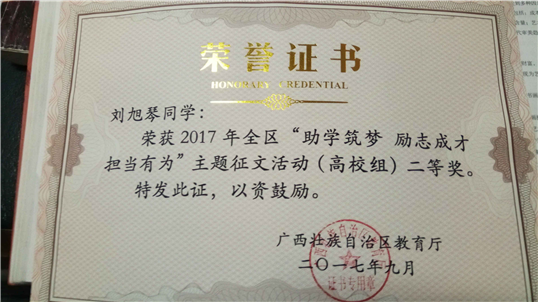16级研究生刘旭琴同学荣获全区征文活动高校组二等奖