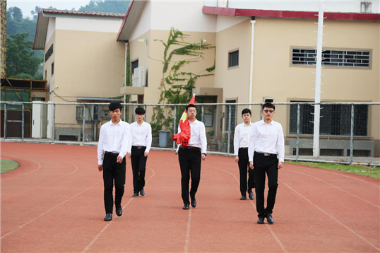 在全体师生的注目下,英姿飒爽的国旗护卫队队员们护送鲜艳的五星红旗进场。行礼完毕,伴随着庄严的《中华人民共和国国歌》,五星红旗冉冉升起,迎风飘扬,在场的师生向国旗行注目礼,深怀对祖国无限的热爱和崇高的敬意。